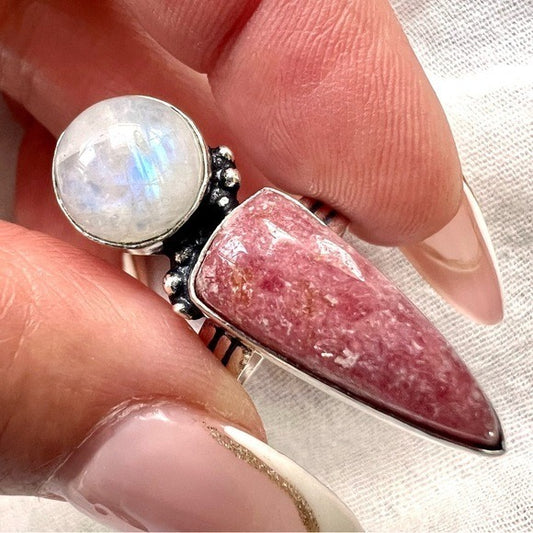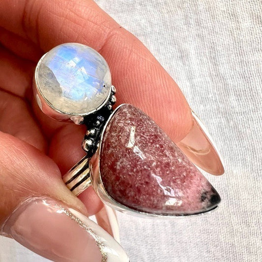 925 LOVE + PEACE Rainbow Flash Moonstone Rhodonite Ring 6.25