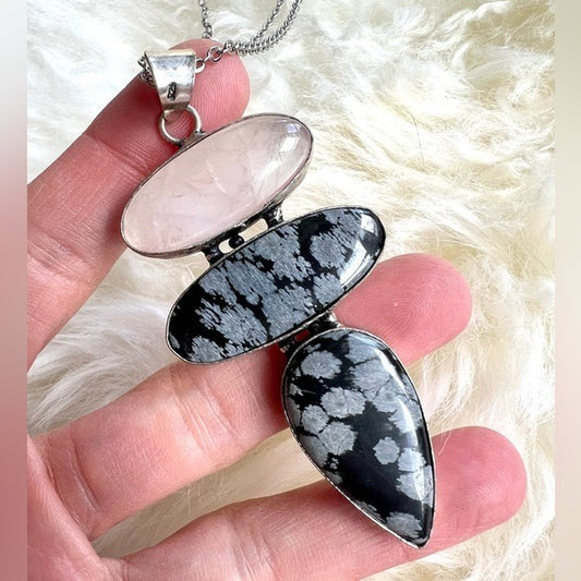 925 Love + Protection Rose Quartz + Snowflake Obsidian Pendant Necklace