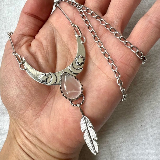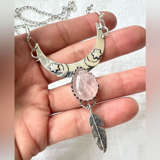 925 Love Rose Quartz Boho Feather + Moon Necklace Pendant