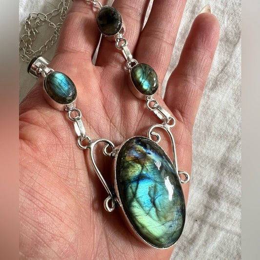 925 WOW! Rainbow Lightning Flash Labradorite 5 Stone Necklace