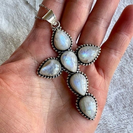 925 WOW! Rainbow Moonstone CROSS Necklace Pendant