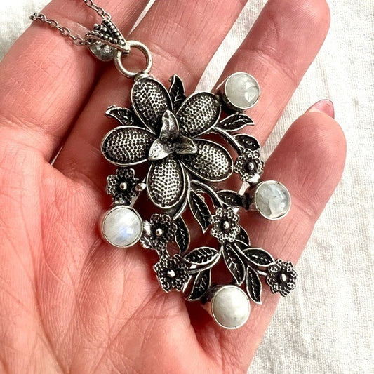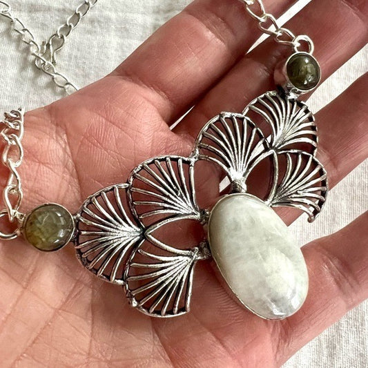 925 Stunning! Ornamental Fan Moonstone + Flash Labradorite Necklace Pendant