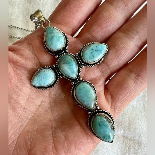 925 Calming Caribbean Larimar Cross Necklace Pendant (you choose size!)