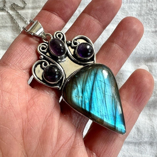 925 BRILLIANT Flash Labradorite + Amethyst Necklace Pendant
