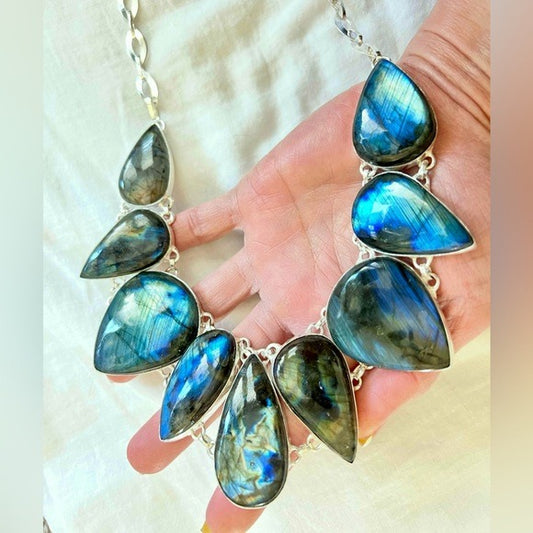 925 GODDESS Blue Flash Labradorite Collar Bib Necklace