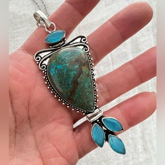 925 AMAZING! Gorgeous Chrysocolla + Chalcedony Pendant Necklace