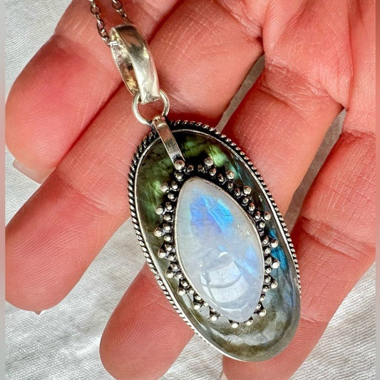 925 Layered Dark Flash Labradorite + Rainbow Flash Moonstone Necklace Pendant