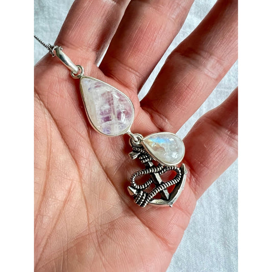 925 Anchor Rainbow Flash Double Moonstone Necklace Pendant