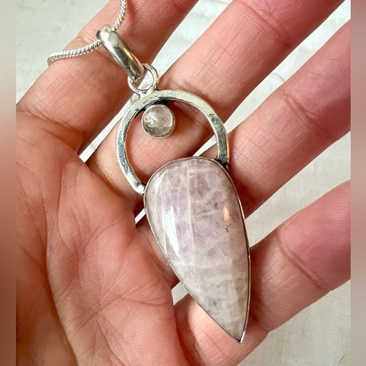 925 GORGEOUS Pale Lepidolite + Rose Quartz Pendant Necklace