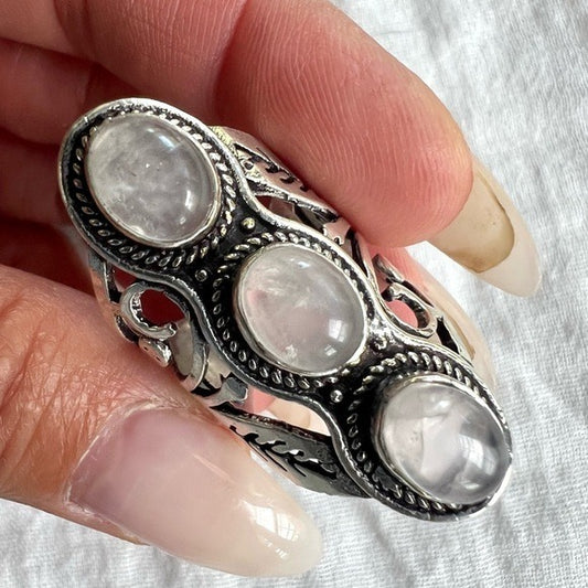 925 Ornate Triple Rose Quartz Shield Ring 7