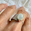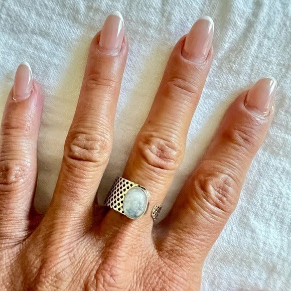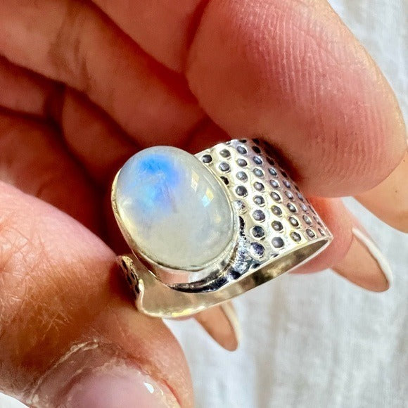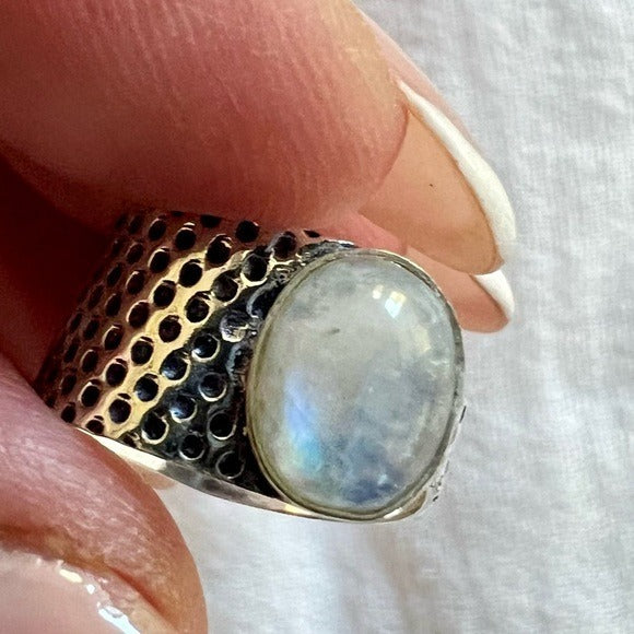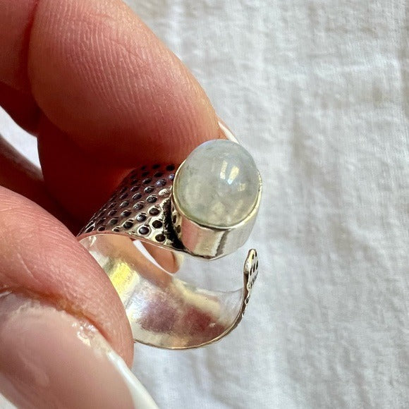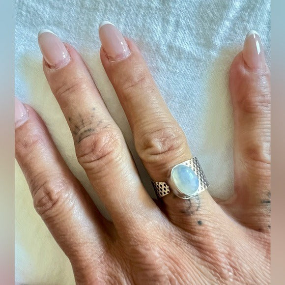 925 Adjustable Embossed Rainbow Flash Moonstone Ring 6, 7, 8