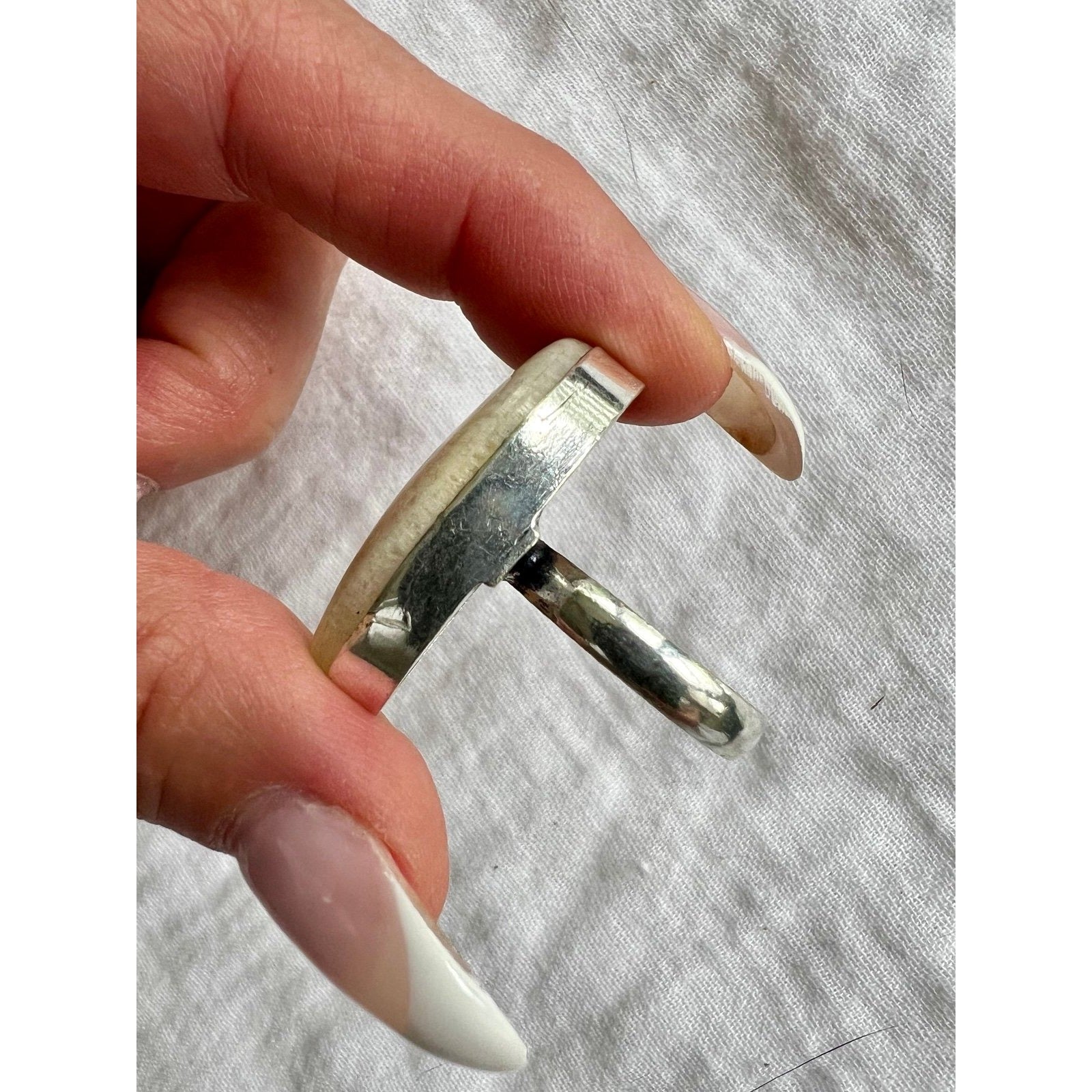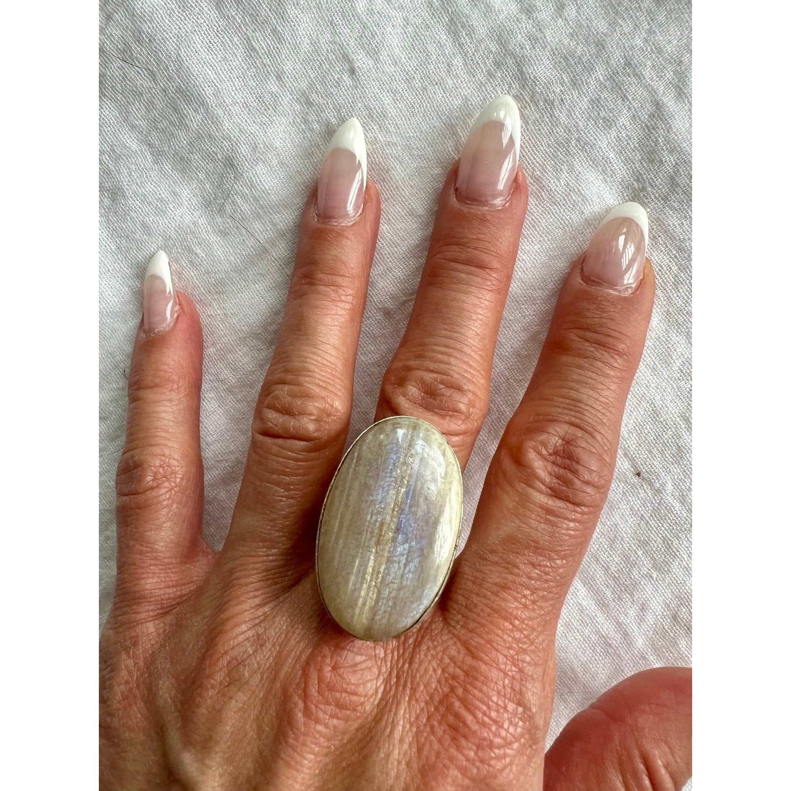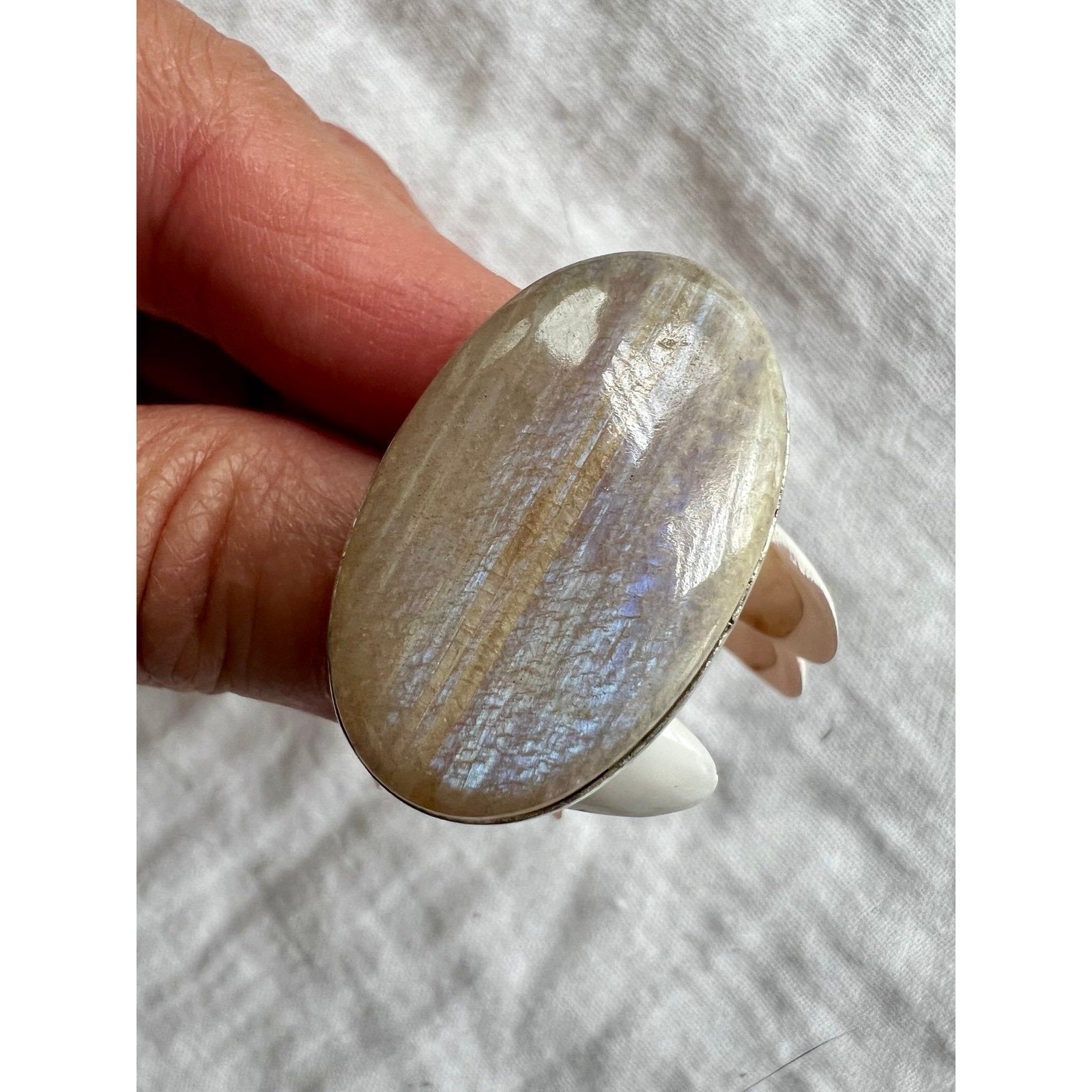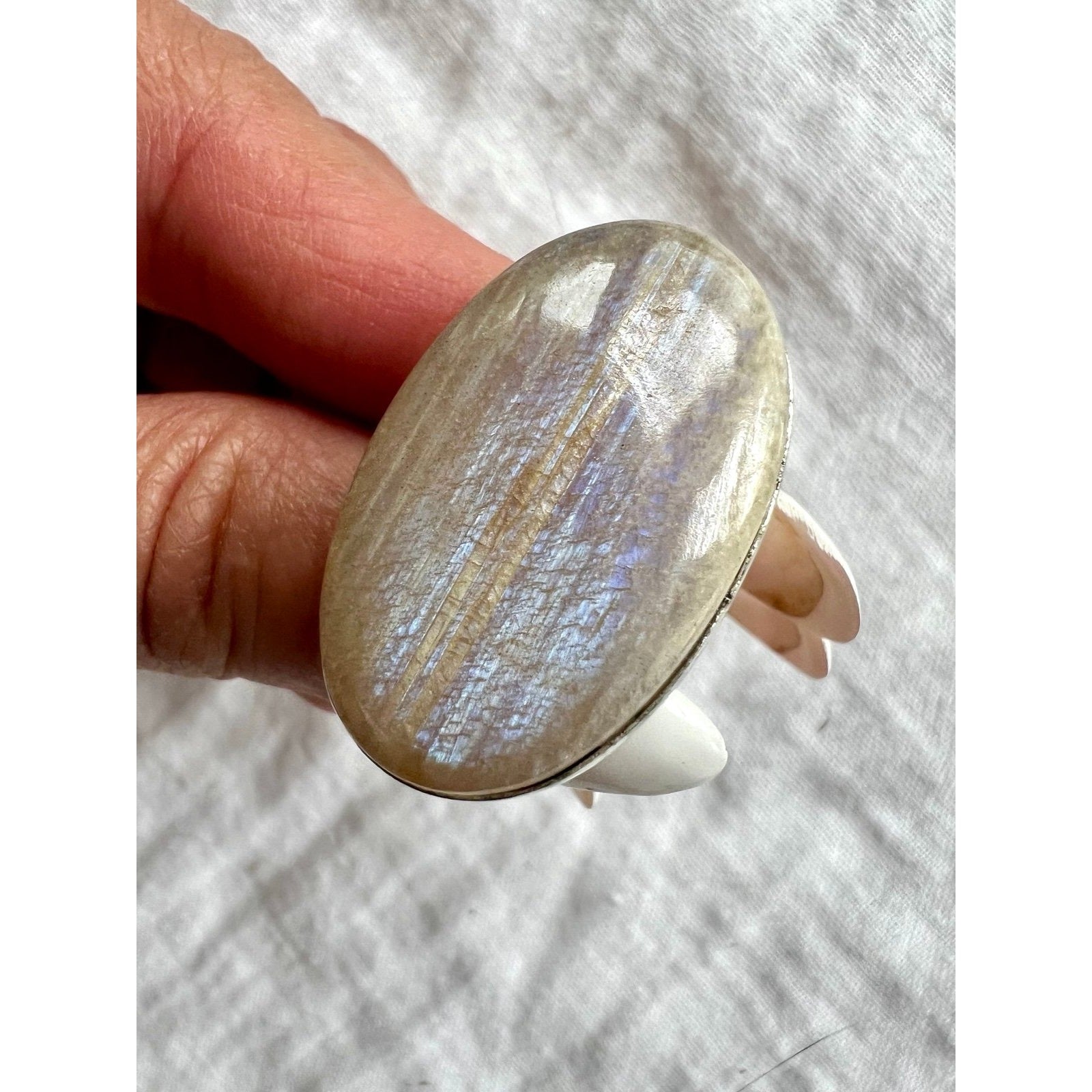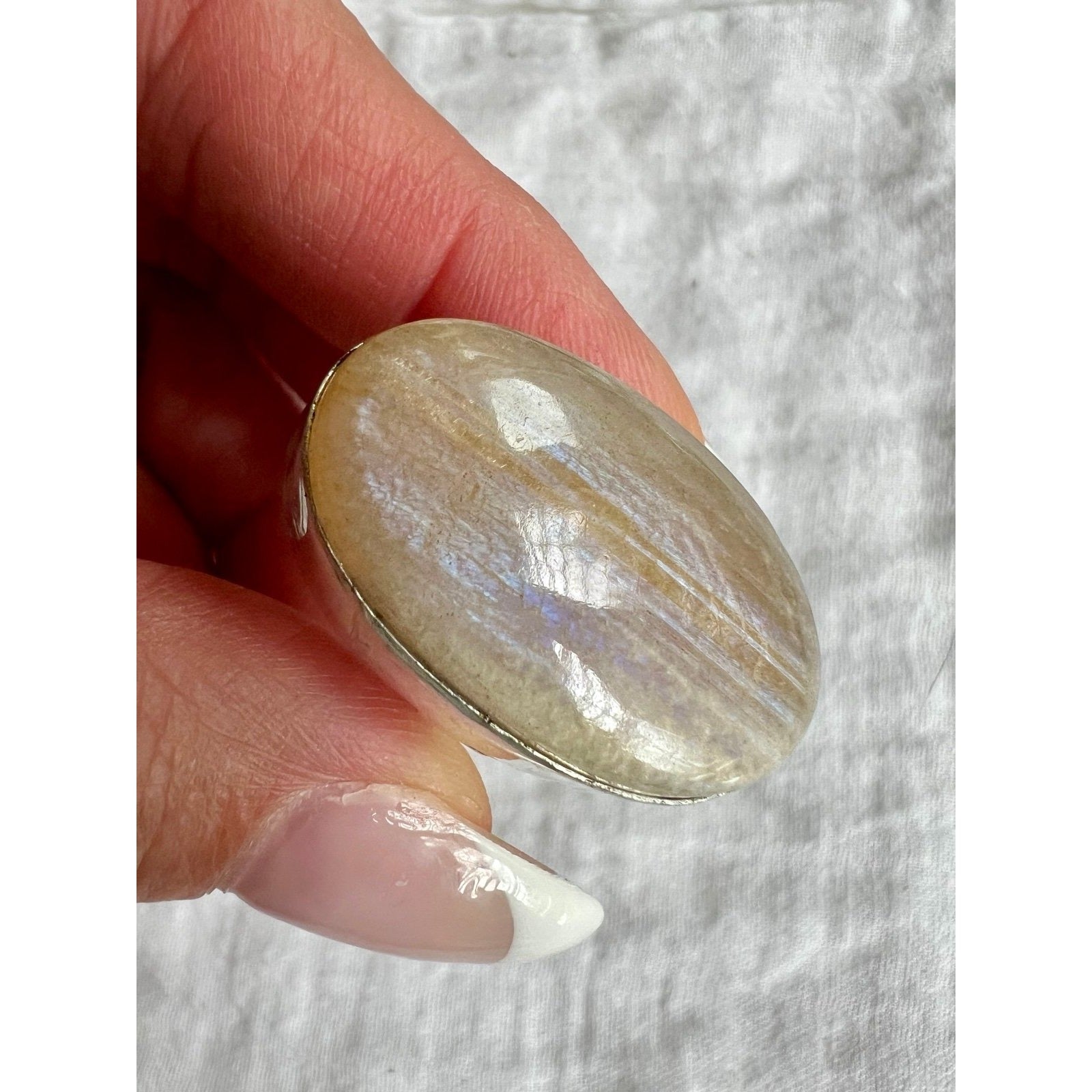 925 Blue Flash PEACH MOONSTONE Cabachon Ring 9.25