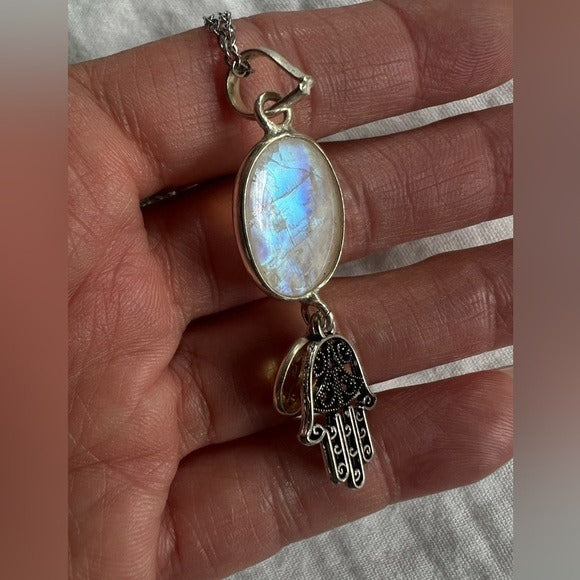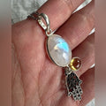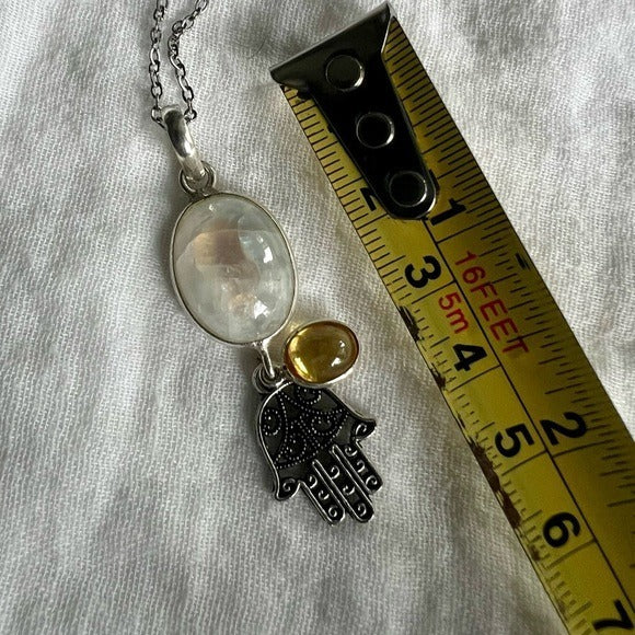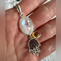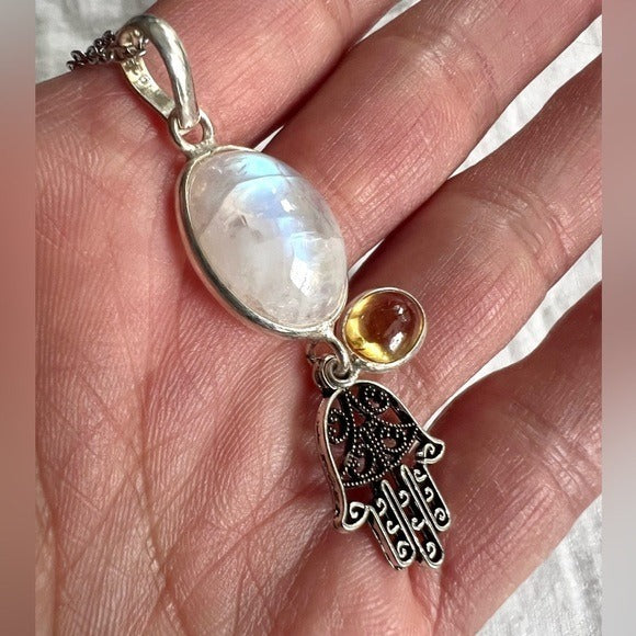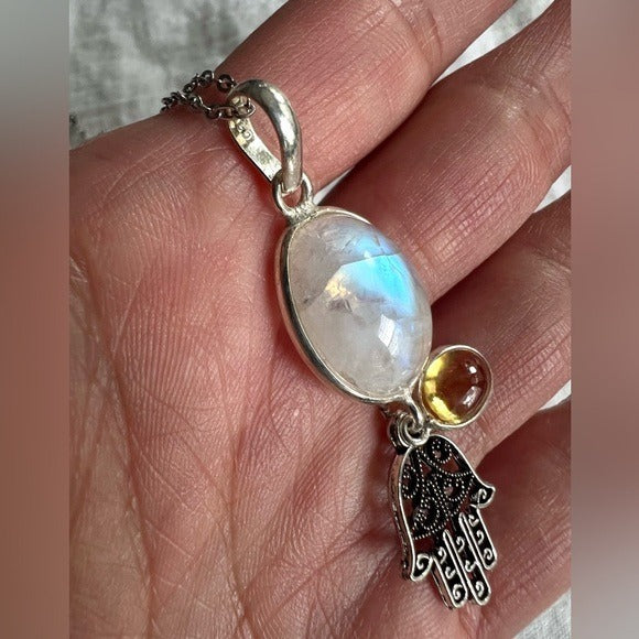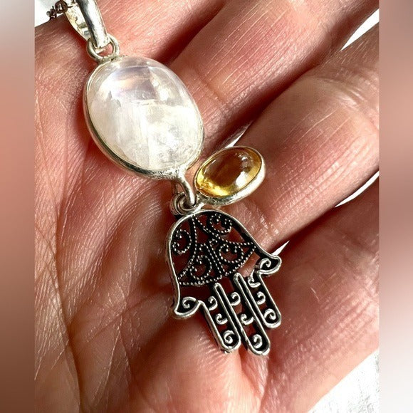 925 Hamsa Rainbow Flash Moonstone + Citrine Pendant Necklace