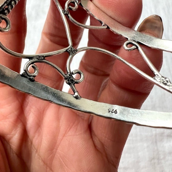 925 stamped sterling silver overlay. Cuff is slightly adjustable.