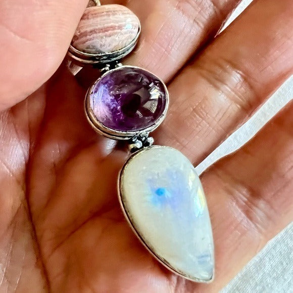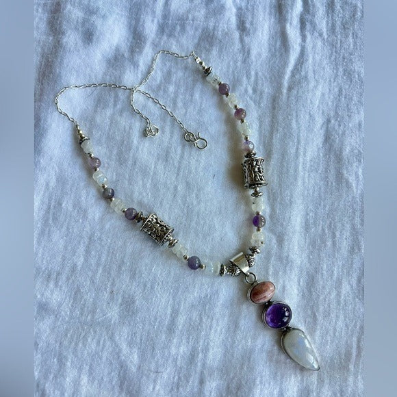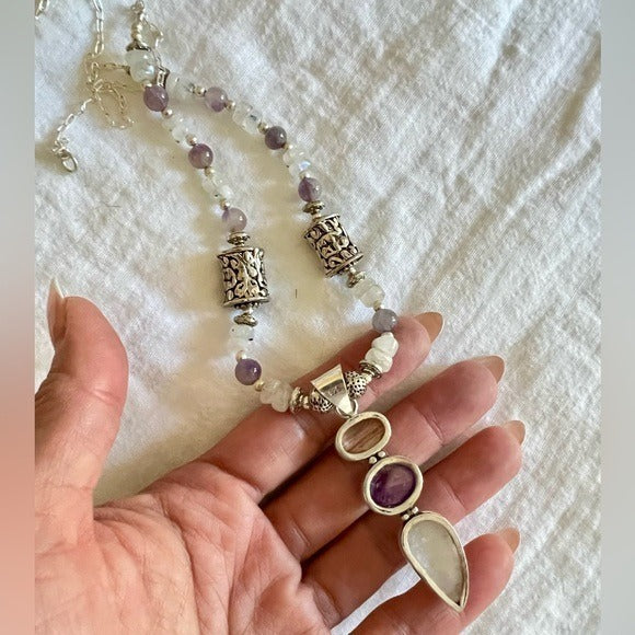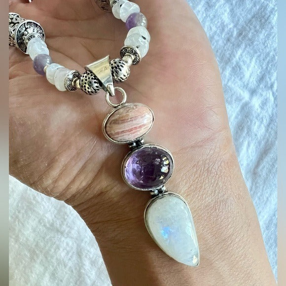 925 OMG OMG GORGEOUS Rainbow Flash Moonstone + Amethyst Beaded Necklace