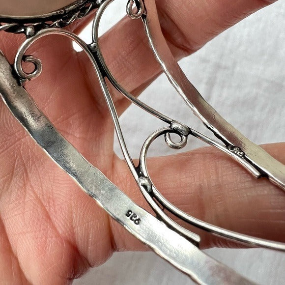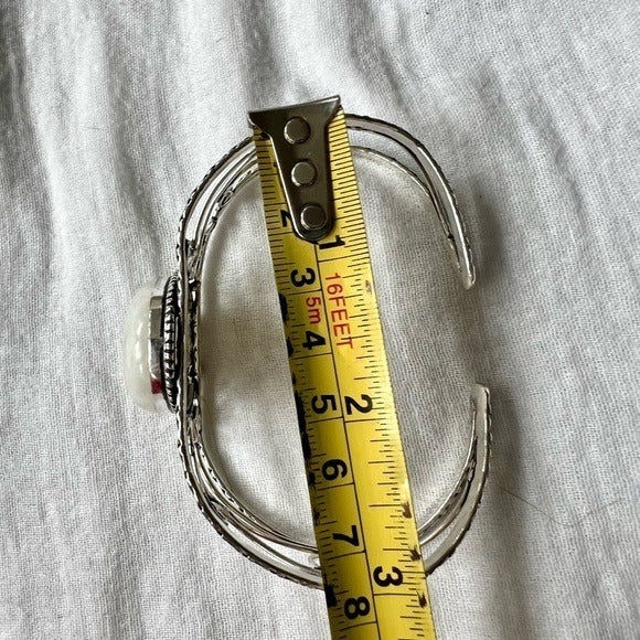 925 stamped sterling silver overlay. Cuff is slightly adjustable.