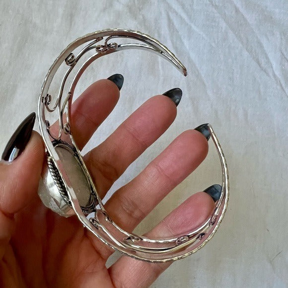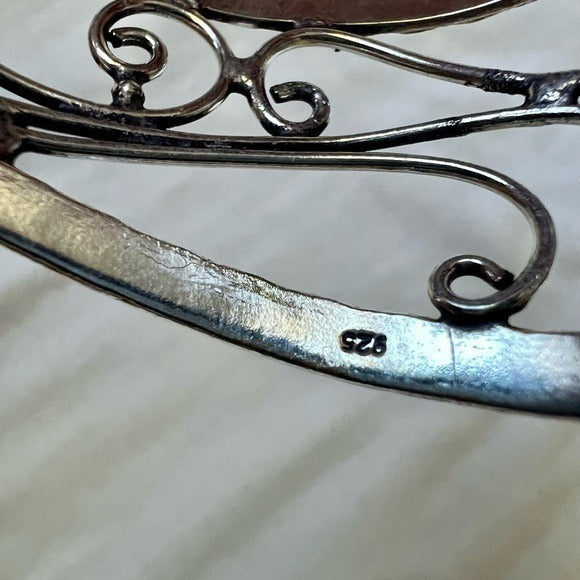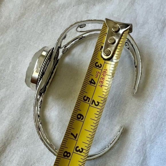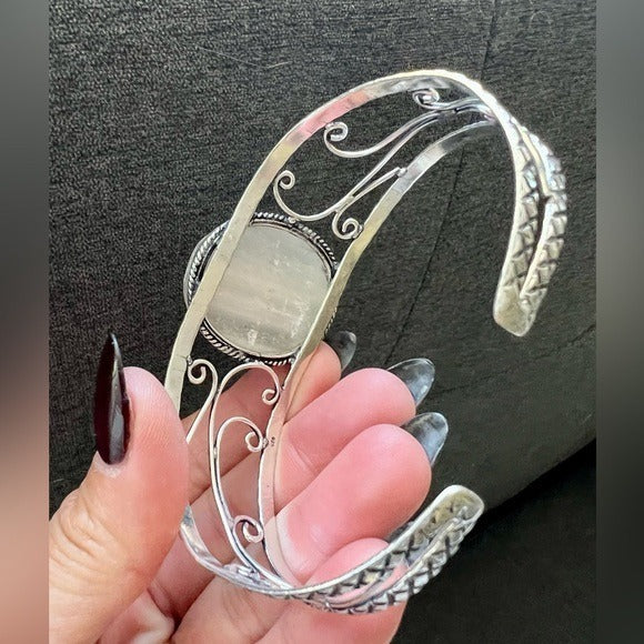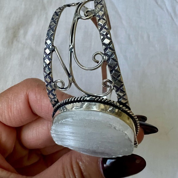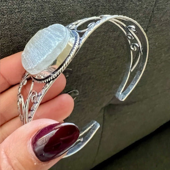 925 stamped sterling silver overlay. Please see all photos for condition, as this is raw selenite.