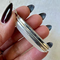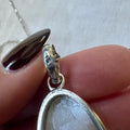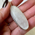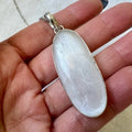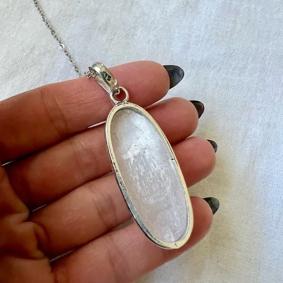 925 stamped sterling silver overlay. Comes on an 18" chain. Please see all photos for condition, as this is raw selenite.