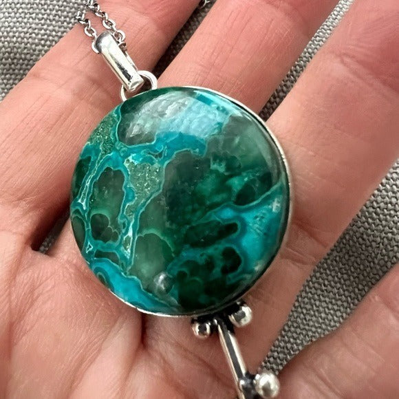 With the combined properties and energies of Chrysocolla and Malachite, it can comfort and protect you in times of high stres and anxiety. They help calm your emotions and bring peaceful and pure energy to you. They can be used for brining balance, confidence, and abundance. It can also clear all seven Chakras, but are especially helpful to the Throat and Heart Chakras.